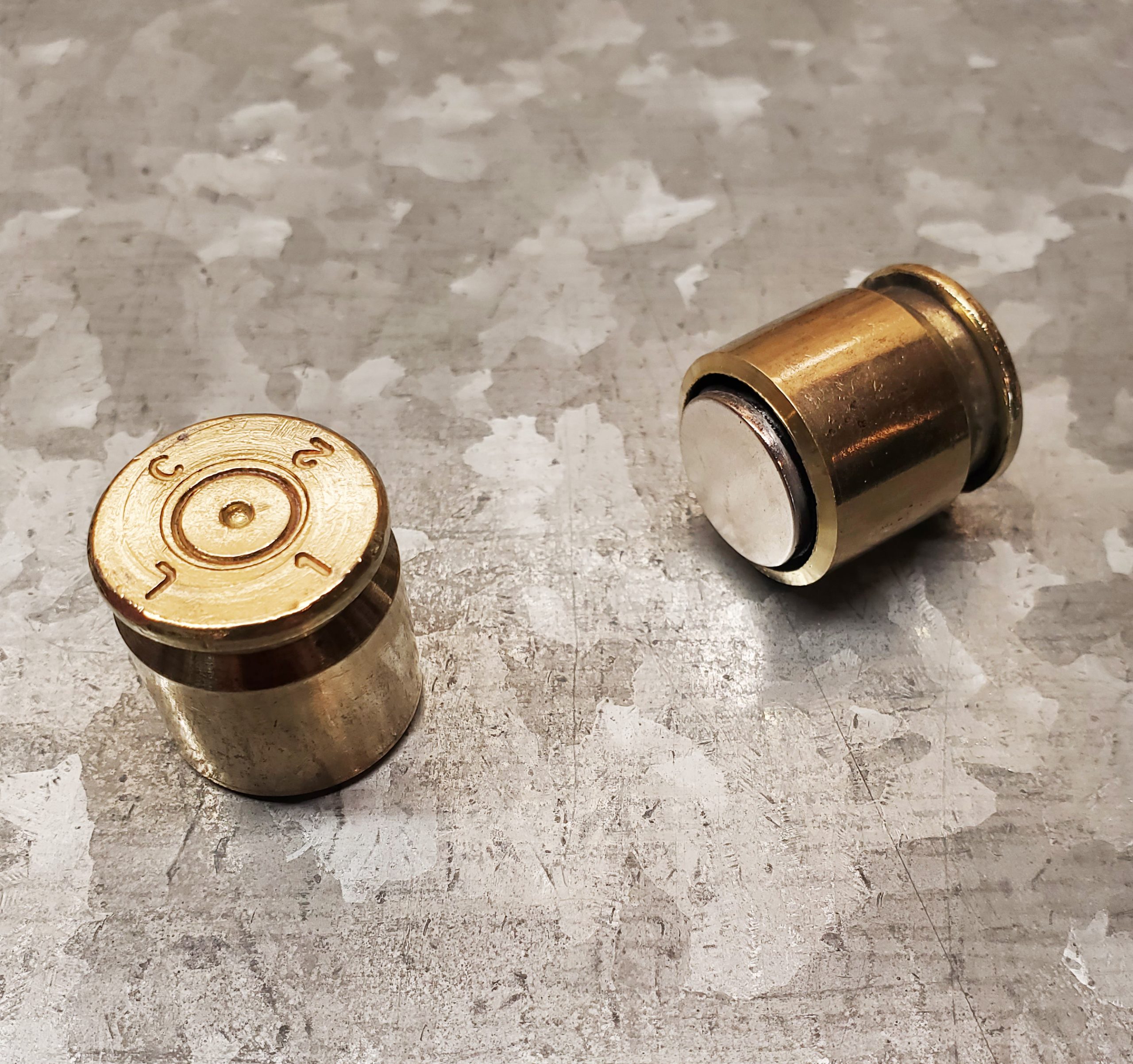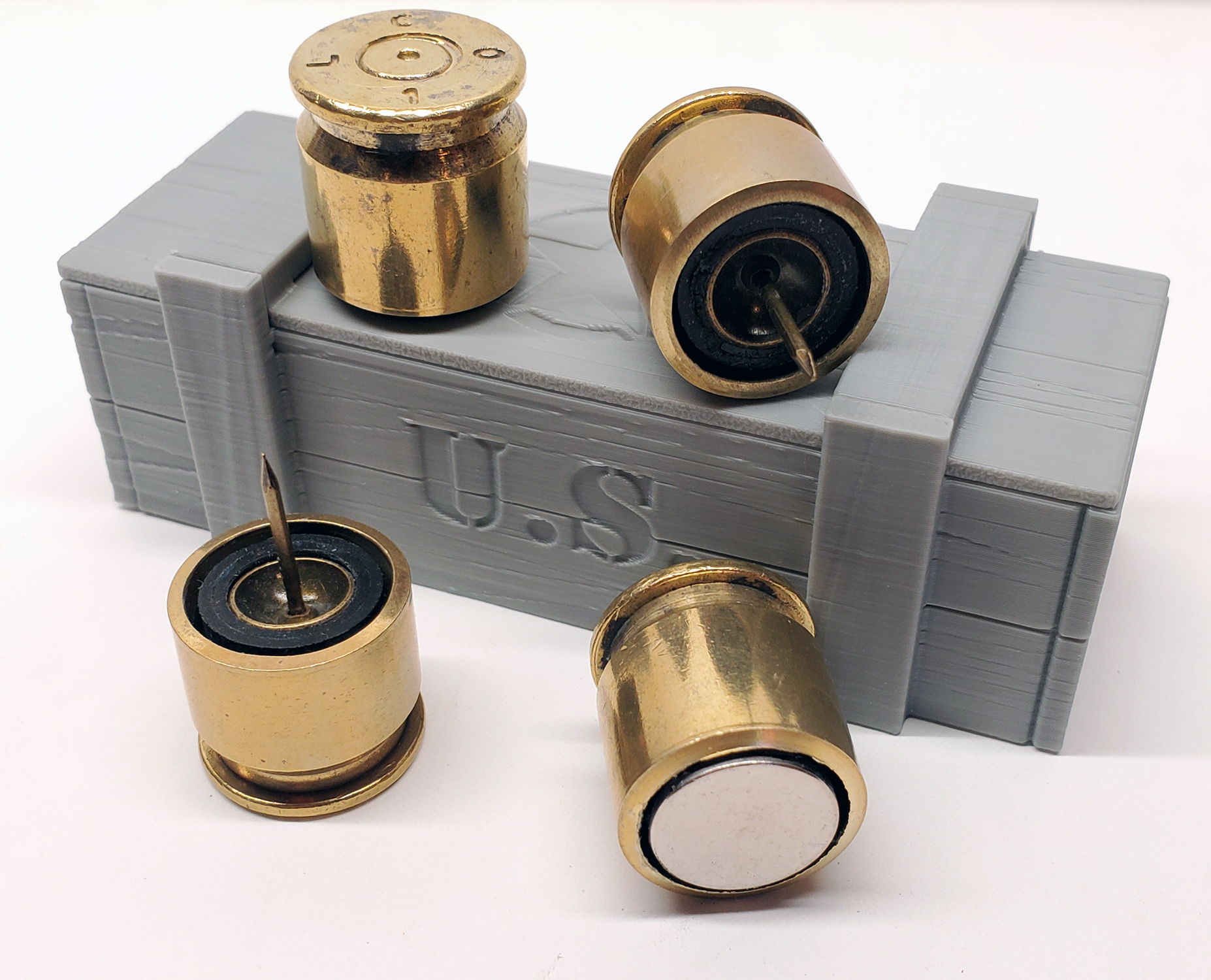 All my push pins and magnets are made from genuine fired shell casings and may contain minor blemishes or scratches consistent with the firing and ejection process. The brass has been cut to about 3/4 inch in length.