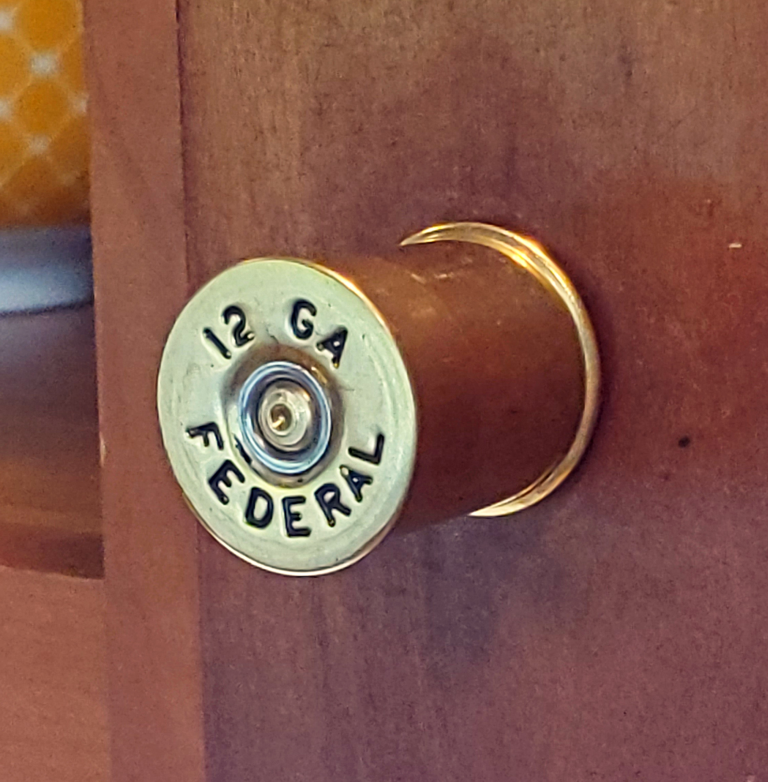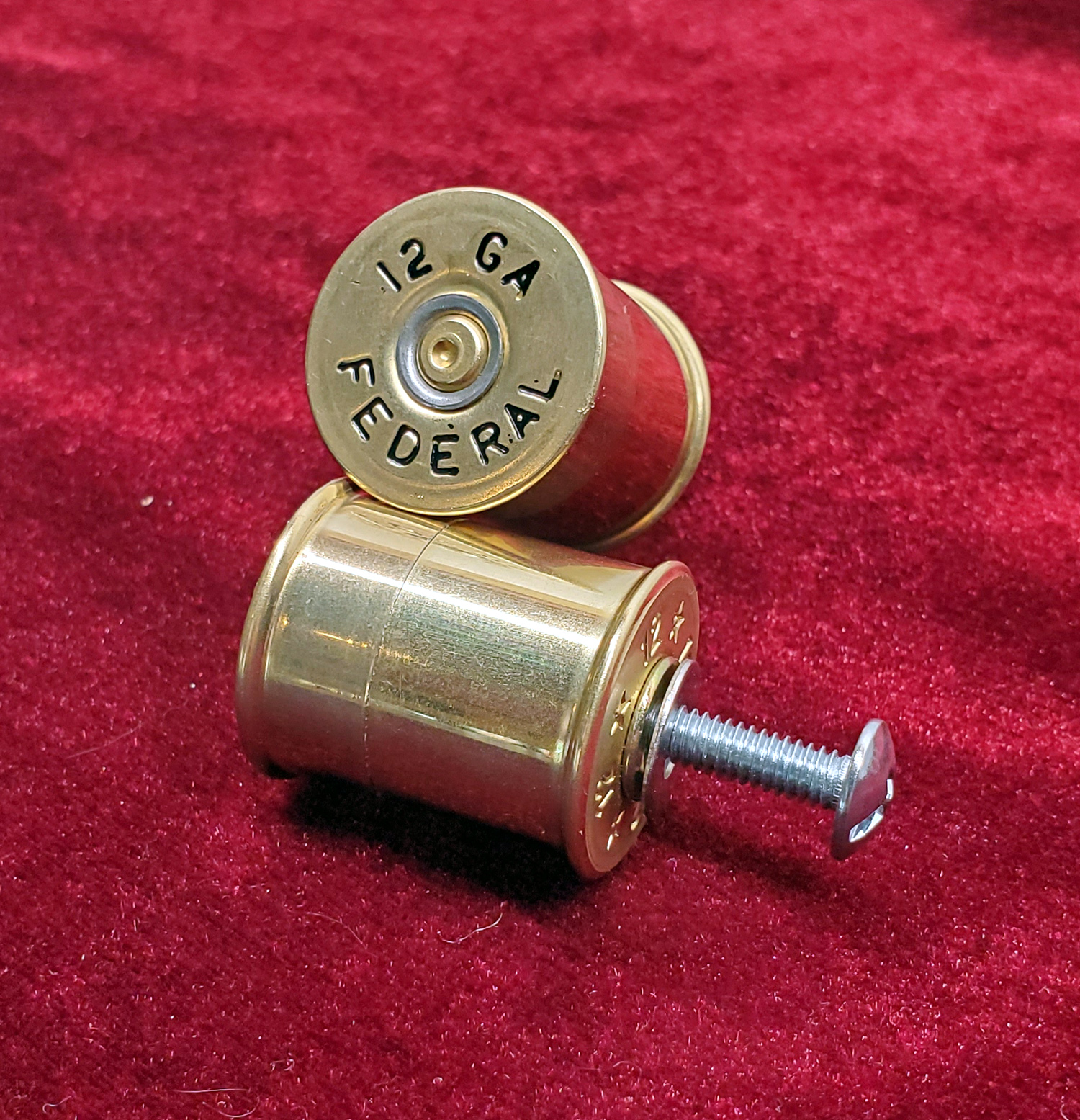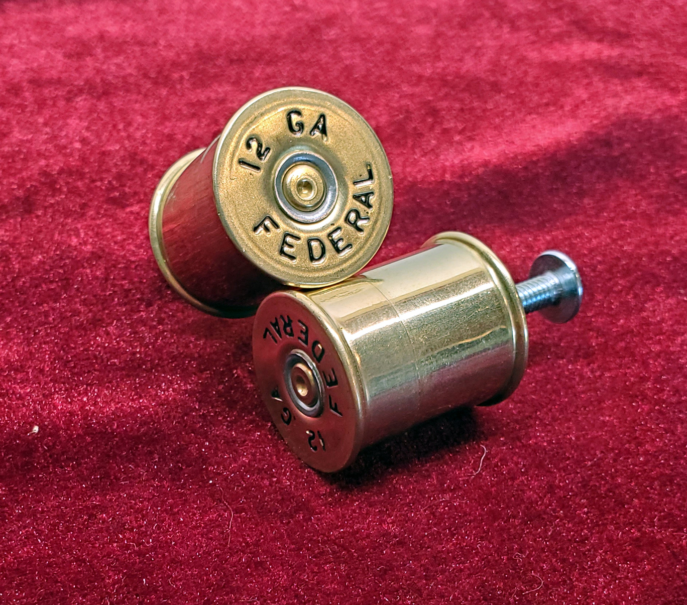 Handcrafted from authentic spent Federal 12-gauge shotgun shell these cabinet knobs are the perfect finishing touch for a gun room, hunting cabin, or “man cave.” The solid brass construction provides a substantial, high-quality feel, while the iconic headstamp design adds a unique conversation piece to any dresser or cabinet.