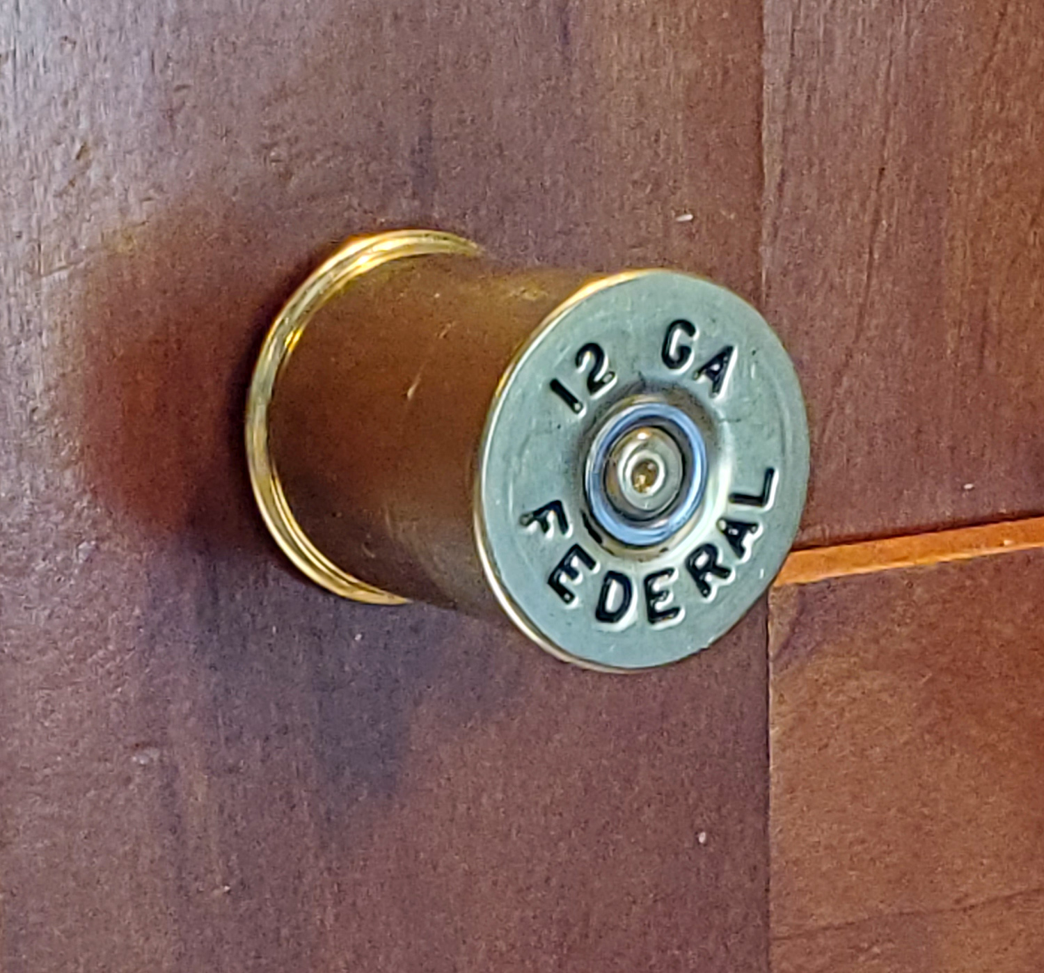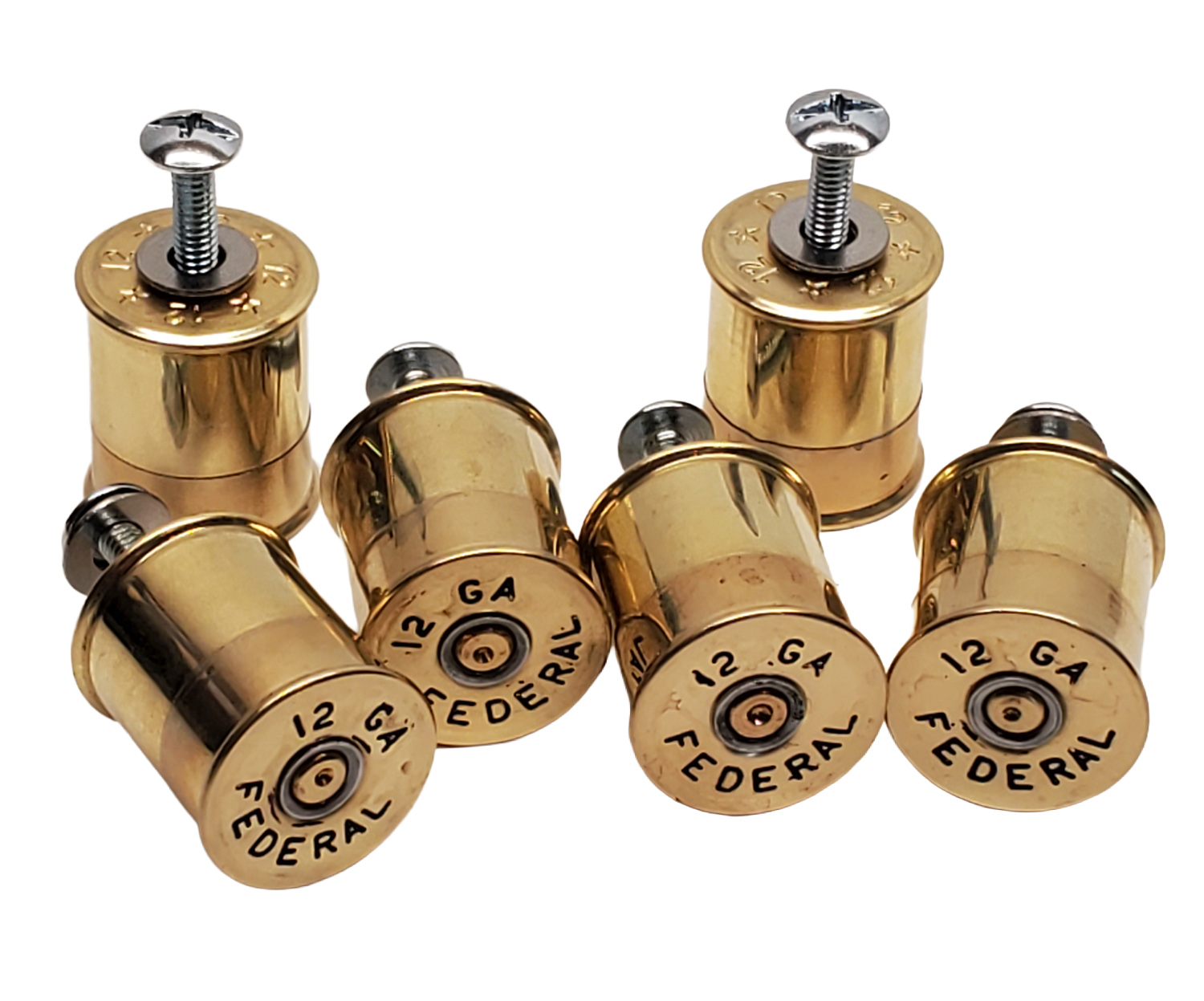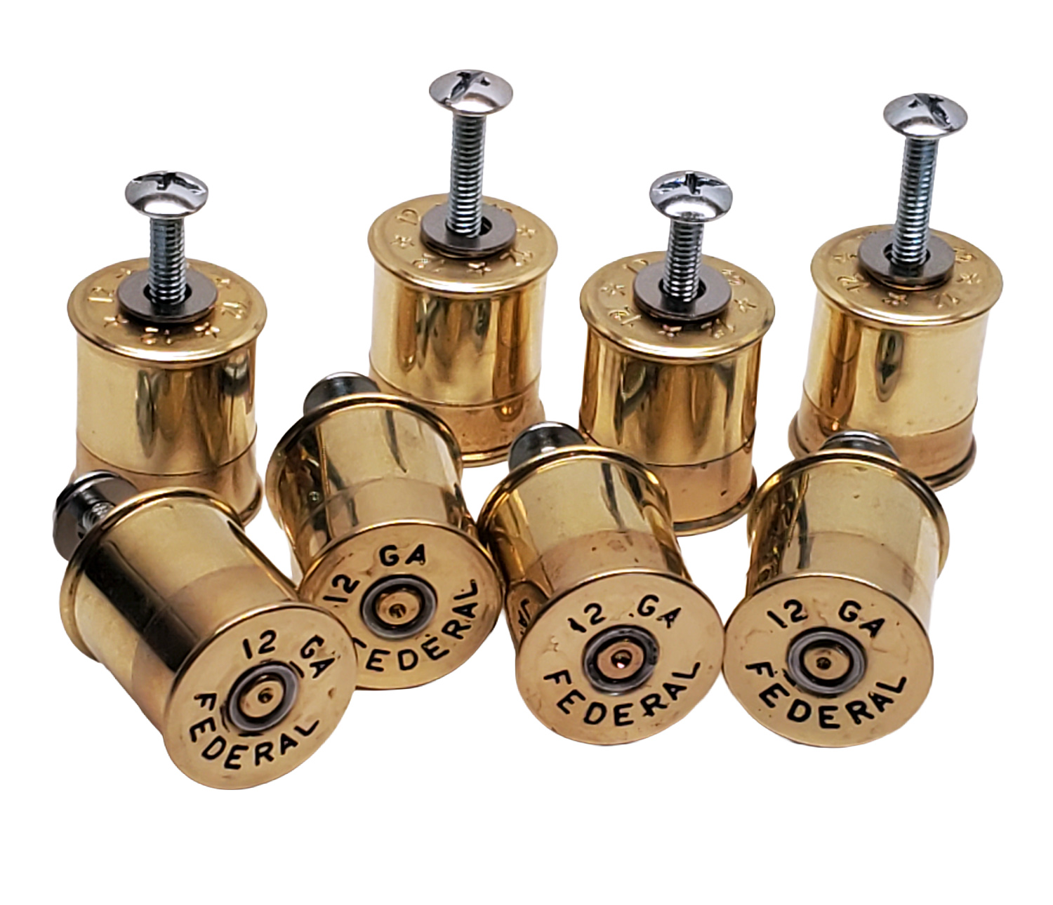 Handcrafted from authentic spent Federal 12-gauge shotgun shell these cabinet knobs are the perfect finishing touch for a gun room, hunting cabin, or “man cave.” The solid brass construction provides a substantial, high-quality feel, while the iconic headstamp design adds a unique conversation piece to any dresser or cabinet.